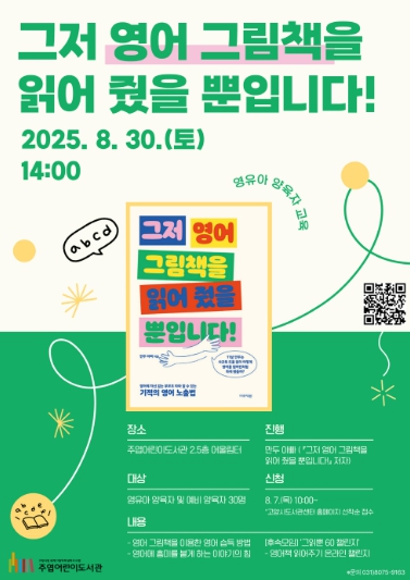 [뉴스노크=김인호 기자] 고양특례시 주엽어린이도서관은 오는 8월 30일 오후 2시에 『그저 영어 그림책을 읽어 줬을 뿐입니다!』의 저자인 ‘만두 아빠’를 초청해 영유아 양육자를 위한 영어 그림책 활용 강연을 개최한다.