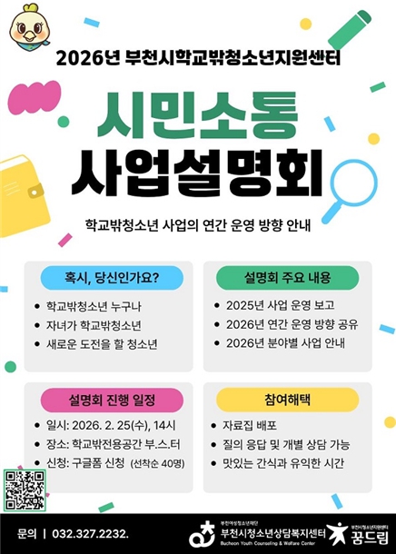 [뉴스노크=김인호 기자] 부천시학교밖청소년지원센터는 오는 2월 25일, 오후 2시 학교밖청소년 전용공간 부.스.터. (송내어울마당 1층)에서 시민과의 소통을 확대하고 2026년 연간 운영계획을 공유하는 ‘사업설명회’를 개최한다고 밝혔다.