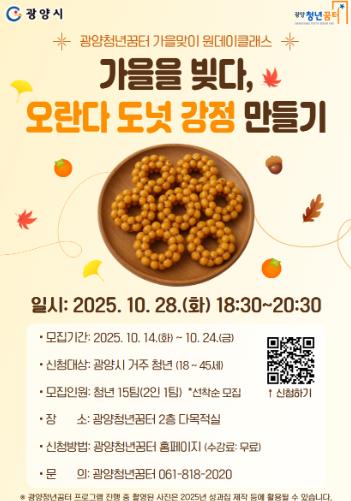 [뉴스노크=김인호 기자] 광양시는 청년들의 여가문화 활성화와 정서적 힐링을 위한 프로그램의 일환으로, 광양청년꿈터에서 가을맞이 원데이클래스 ‘가을을 빚다 – 오란다 도넛 강정 만들기’ 참가자를 모집한다고 14일 밝혔다.