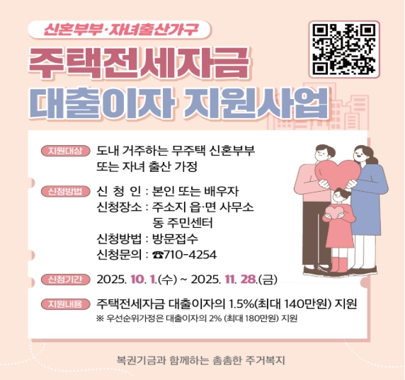 지원 대상은 신청일 기준 7년 이내 혼인 신고를 했거나 자녀를 출산한 무주택 가구 중 금융권에서 주택전세자금 대출을 받은 도민이다.