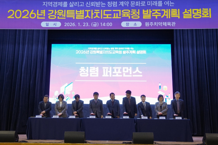 [뉴스노크=김인호 기자] 강원특별자치도교육청은 23일 원주 치악체육관에서 청렴한 계약문화 확산과 지역경제 상생을 위한 ‘2026년 공사·용역·물품 발주계획 설명회’를 개최했다.