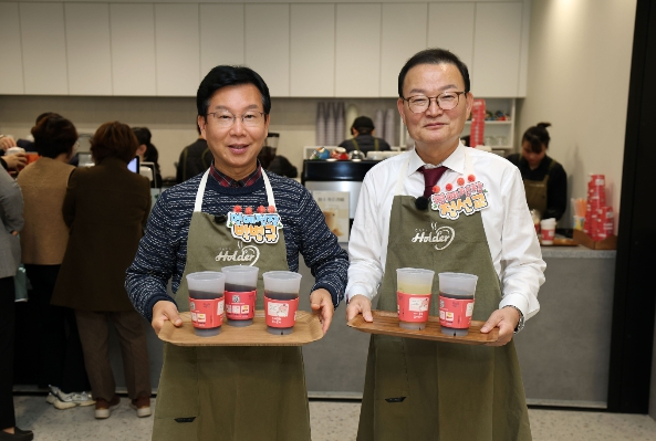 [뉴스노크=김인호 기자] 박병규 광산구청장과 정선교 대명외식산업 대표가 27일 광산구청 1층 모두의 쉼터 조성을 기념해 청각장애인의 자립을 돕는 일터인 구청 내 ‘카페홀더’에서 일일 명예점장 사회공헌활동을 진행했다.