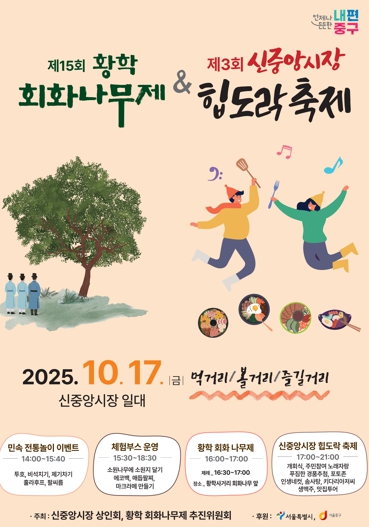 [뉴스노크=김인호 기자] 서울 중구 황학동의 오랜 전통을 품은‘황학회화나무제’와 젊은 감각이 살아 있는‘신중앙시장 힙도락(HIP:道樂) 축제’가 오는 17일 오후 2시에 함께 열린다. 두 축제는 2023년부터 연계 개최해, 황학동의 가을을 더욱 풍성히 채우고 있다.