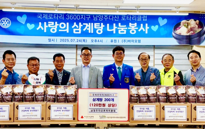 [뉴스노크=김인호 기자] 남양주시는 24일 국제로타리3600지구 남양주다산로타리클럽이 중복을 맞아 지역 내 취약계층을 위한 완조리 삼계탕 200개를 다산1동 지역사회보장협의체(위원장 정순옥)에 기탁했다고 밝혔다.