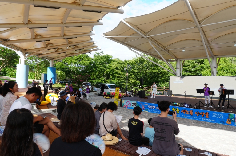 공연은 사회자 변성재의 유쾌한 멘트로 문을 열었다. ‘해변으로 가요’가 흐르고, 아코디언과 노래(황운천·김수길), 기타와 하모니카(이승백), 색소폰 4중주(신성애 외 3인)가 이어졌다. 관객과 무대의 경계는 자연스레 허물어졌고, 노래자랑으로 분위기는 한껏 무르익었다.