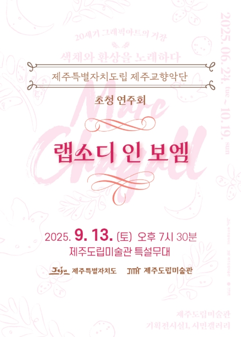 [뉴스노크=김인호 기자] 제주특별자치도 제주도립미술관이 현재 진행 중인《마르크 샤갈》과 《강태석》 기획전시와 연계한 특별 클래식 연주회를 개최한다.