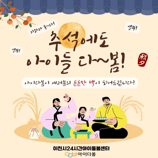 [뉴스노크=김인호 기자] 이천시는 추석 연휴 기간에도 이천시 24시간 아이돌봄센터인 ‘아이다봄’을 365일 24시간 정상 운영해 연휴 중 발생할 수 있는 돌봄 공백을 최소화한다고 밝혔다.