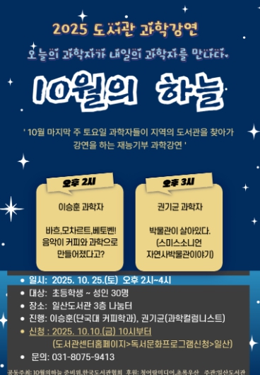 [뉴스노크=김인호 기자] 고양특례시 일산도서관에서는 과학자들의 재능기부 도서관 과학 강연프로그램 ‘10월의 하늘’을 운영한다.