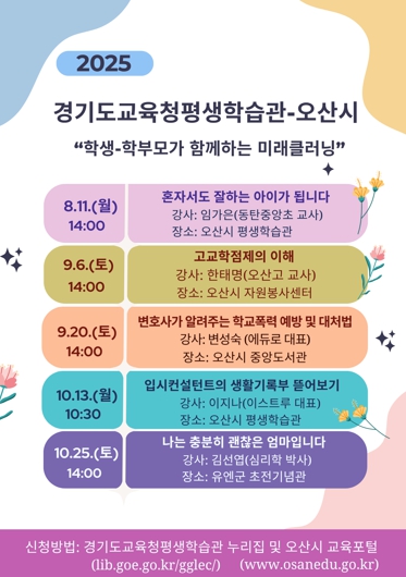 참여를 희망하는 학생과 학부모는 경기도교육청평생학습관 누리집 ‘학부모·지역주민프로그램’ 또는 오산시 교육포털을 통해 수강 신청할 수 있다.