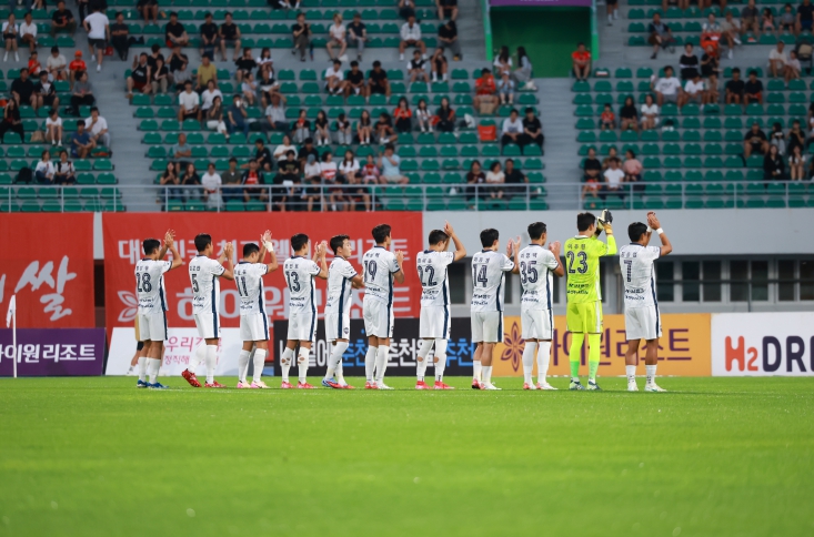 ▲ 8월 9일 강원 원정에서 김천상무 선수들이 경기 종료 후 팬들에게 인사하고 있다. |
