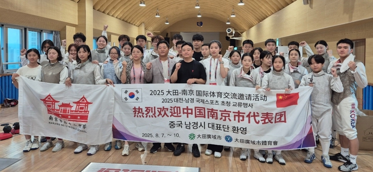 [뉴스노크=김인호 기자] 대전시와 자매도시 중국 난징시가 ‘2025 대전-난징 국제 스포츠 초청 교류대회’를 통해 스포츠와 문화 교류에 한창이다. 7일 입국한 난징시 제12고등학교 펜싱선수단 15명은 8일에서 9일까지 대전생활과학고 펜싱장에서 양 도시 고등학생 선수들과 합동훈련과 친선경기를 이어가며 우정을 쌓는다.