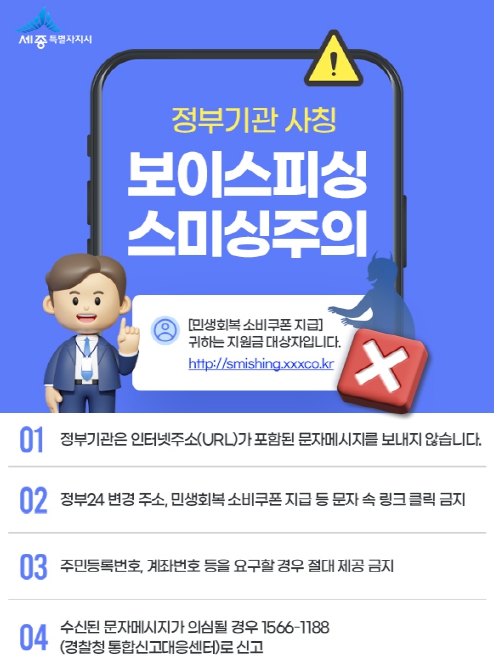 [뉴스노크=김인호 기자] 세종특별자치시가 국가정보자원관리원 화재로 인한 전산시스템 복구 기간 전화나 문자메시지로 대체사이트 접속, 앱 재설치 등을 유도하는 범행이 우려됨에 따라 각별한 주의를 당부했다.