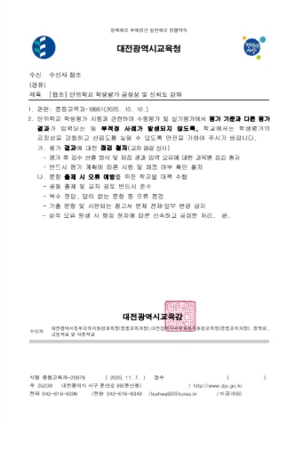 [뉴스노크=김인호 기자] 대전시교육청은 11월 7일 단위학교의 수행평가 및 실기평가 관련 공정성을 강화하도록 전 학교에 긴급 안내했다고 밝혔다.