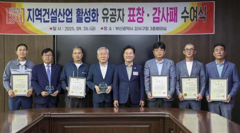 [뉴스노크=김인호 기자] 부산 강서구는 9월 26일, 강서구청 3층 구청장실에서 '지역건설산업 활성화 유공자 표창장 및 감사패 수여식'을 개최했다.