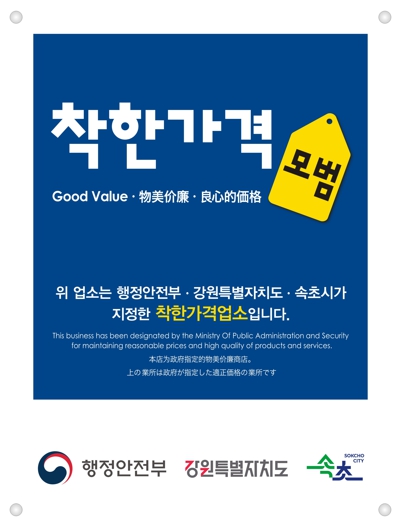 [뉴스노크=김인호 기자] 속초시는 저렴한 가격으로 양질의 서비스를 제공해 지역 물가안정에 기여하는 ‘착한가격업소’7개소를 8월 11일부터 29일까지 모집한다.