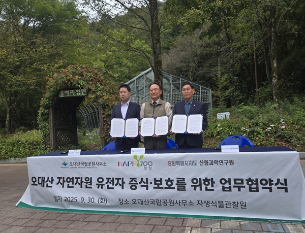[뉴스노크=김인호 기자] 강원특별자치도 산림과학연구원은 9월 30일 국립공원공단 오대산국립공원사무소, 평창군과 우수 산림 유전자원 보존을 위한 업무협약을 체결하고, 오대산국립공원 내 보호수로 지정된 잎갈나무의 후계목을 육성하고 있다고 밝혔다.