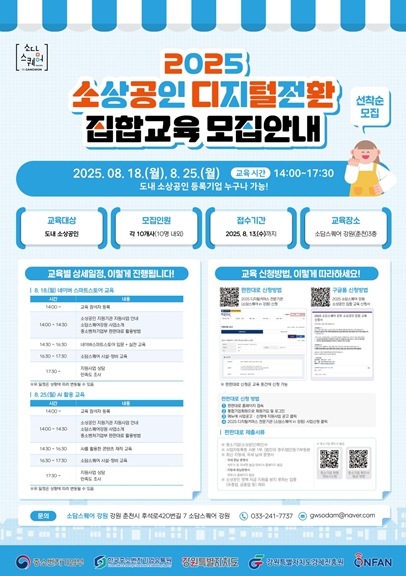 소상공인 디지털전환 집합교육은 8월 18일과 25일 오후 2시, '소담스퀘어 in 강원' 글로벌스튜디오(춘천)에서 진행된다. 이번 교육은 '스마트스토어 입점', 'AI를 활용한 콘텐츠 제작' 주제로 각각 진행되며, 이후 9월~11월까지도 다양한 디지털 전환 주제로 전문교육을 이어갈 예정이다.