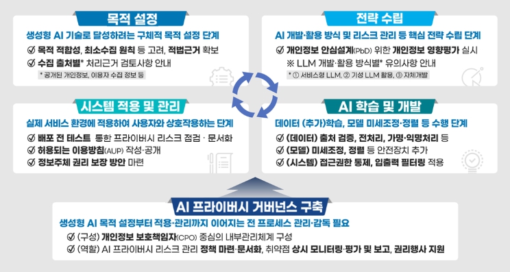 구체적으로 ①목적 설정 단계에서 인공지능 개발 목적을 명확히 하고, 개인정보 종류·출처별 인공지능 학습에 필요한 적법 근거를 다룬다. ②전략 수립 단계는 개발 방식을 나누어 유형별 리스크 경감 방안을 안내한다. ③학습 및 개발 단계는 데이터오염, 탈옥 등 리스크를 고려한 다층적 안전조치를 제시하고 인공지능 에이전트의 관리 방안도 포함했다. ④적용 및 관리 단계는 정보주체 권리 보장 등을 중점적으로 다룬다. ⑤마지막으로 전체 과정에서의 개인정보 보호 관점을 내재화하기 위해 필수적인 개인정보보호책임자(CPO) 중심의 거버넌스 구축 방안을 제시한다. 이러한 기반에서 기업·기관은 위 과정을 반복하며 시스템을 고도화·개발하는 것이 권장된다.
