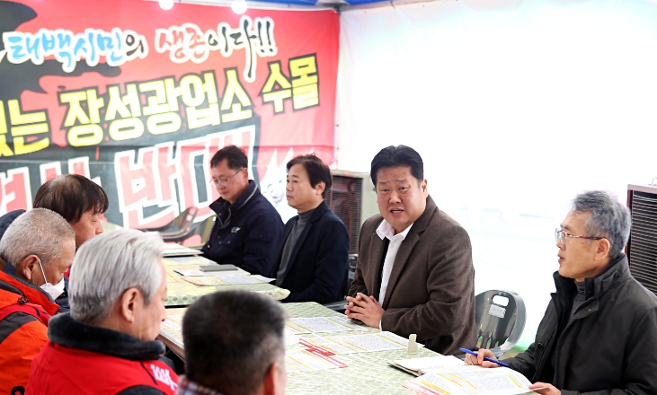 이상호 태백시장은 지난 3일 장성광업소 수몰 반대 투쟁위원회 야외 투쟁 본부를 찾아 “한파에도 태백의 역사이자 대한민국 산업화의 상징인 장성광업소를 지키고자 하는 지역주민의 투쟁 현실에 마음이 매우 무겁다”며 “지역주민의 의견이 최우선인 만큼 지속적으로 소통하며 의견을 따르겠다”고 밝혔다.