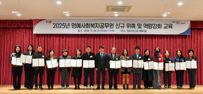 [뉴스노크=김인호 기자] 김포시는 지난 26일 통·리장과 지역사회보장협의체 위원 등 지역 주민 181명을 신규 명예사회복지공무원으로 위촉했다. 이 중 대표 15명에게 위촉장을 수여했으며, 약 100명을 대상으로 역량 강화 교육도 함께 진행했다.