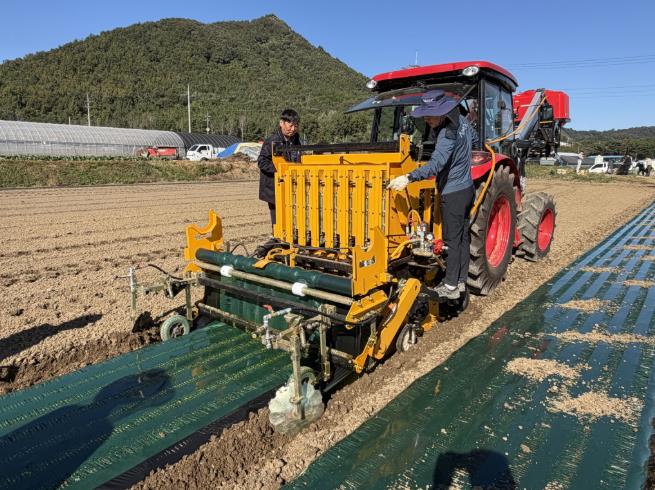 이날 연시회에서는 두둑 형성, 비닐멀칭, 파종, 농약 살포가 한 번에 가능한 마늘 복합파종기가 시연됐다.