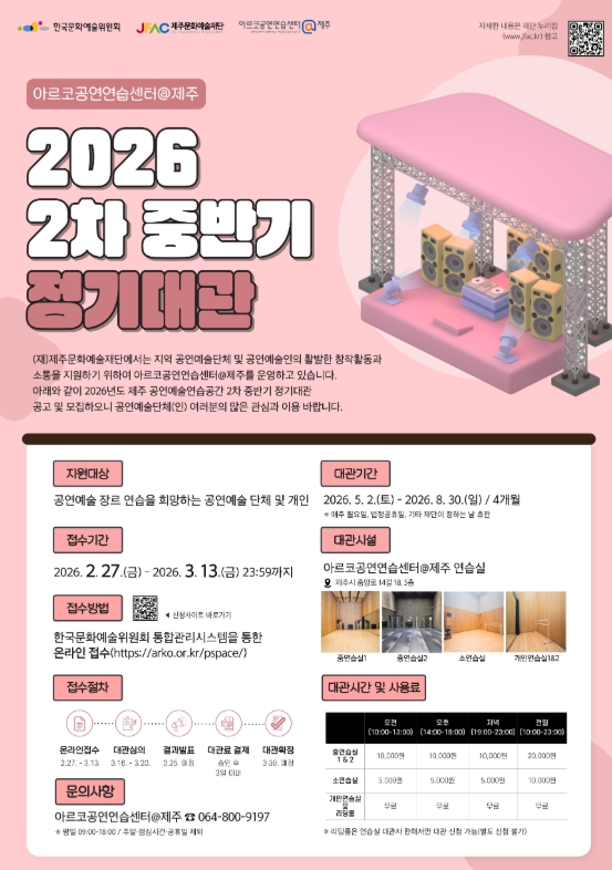 [뉴스노크=김인호 기자] 제주문화예술재단(이사장 김석윤)은 공연예술 장르 연습을 희망하는 예술가(단체)를 대상으로 『아르코공연연습센터@제주』 2026년 2차 중반기(5월~8월) 정기대관 공모를 2월 27일부터 3월 13일까지 진행한다.