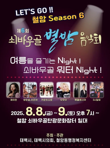 ‘레츠고 철암 시즌6’를 주제로 열리는 이번 음악회는 2000년대의 추억을 되살리는 인기가수 공연과 신나는 디제잉 무대를 통해 다양하고 흥겨운 즐길 거리를 제공하며, 관람객들의 적극적인 참여로 축제의 분위기를 고조시킬 예정이다.