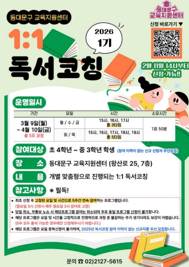 [뉴스노크=김인호 기자] 서울 동대문구가 학생 맞춤형 독서교육 프로그램인 ‘2026년 상반기 1:1 독서코칭’을 운영한다.