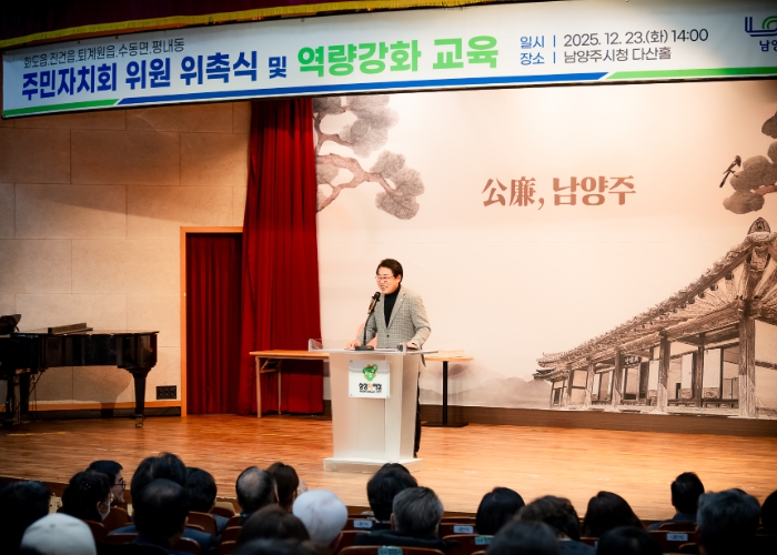 이번 위촉식은 2026년부터 새롭게 임기를 시작하는 화도읍, 진건읍, 퇴계원읍, 수동면, 평내동 주민자치회 위원들의 새로운 시작을 응원하고, 주민자치회 구성 운영과 위원의 역할 등에 대한 역량강화 교육을 실시하기 위해 개최됐으며, 조성대 의장과 시의원 및 주광덕 남양주시장, 도의원, 5개 읍면동 신임 주민자치회 위원 등 140여명이 참석했다.