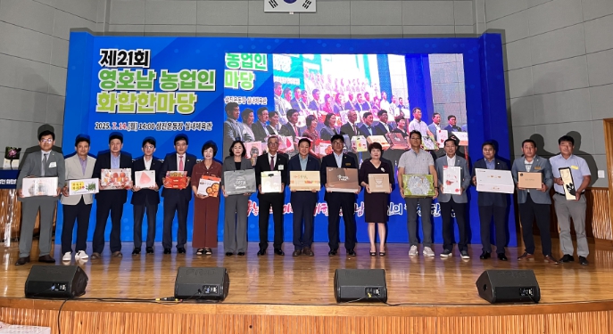 행사에선 또 전남 장흥 표고버섯, 나주배, 영광 톡소주, 경남 함안 수박, 단감즙 등 영호남 대표 농특산물 교환으로 우수한 농업기술 정보와 상생 네트워크를 다졌다.