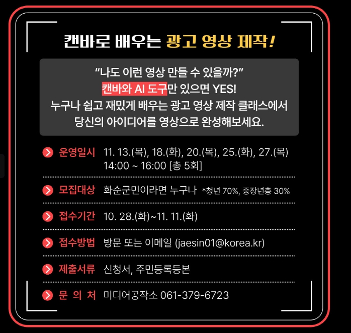 [뉴스노크=김인호 기자] 화순군은 오는 11월13일 오후 2시 화순군 청년센터(청춘들락) 미디어공작소에서 화순군민을 대상으로 AI와 캔바로 배우는 광고영상 제작하기 교육을 진행한다고 밝혔다.