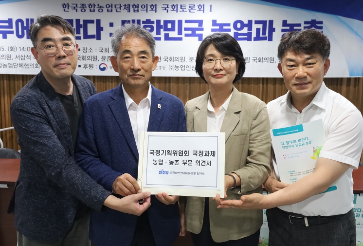 ▲ 15일 임미애 전국농어민위원장은 윤준병 국정기획위원에게 국정과제 의견서를 전달했다. 왼쪽부터 송원규 전국농어민위원회 정책센터소장, 윤준병 의원, 임미애의원, 김상민 전국농어민위원회 산림위원장 |