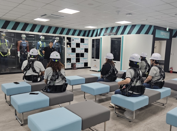 ▲ 안전장비 착용 후 체험형 안전교육을 듣고 있다 |