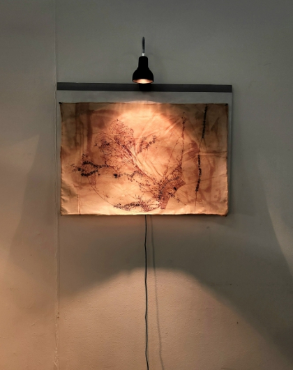 | ▲ 강지율, 〈새와 새가 만나고〉, 2025, 천연 고무액에 주삿바늘로 시온물감, 실크스크린, 마판, 열전등, 50x75cm. (이미지: 작가 제공) |