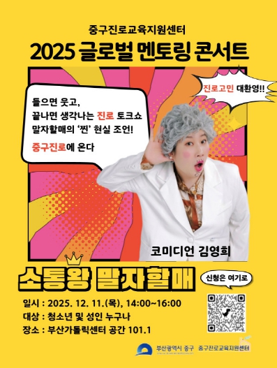 [뉴스노크=김인호 기자] 부산 중구는 오는 11일 오후 2시 부산가톨릭센터 공간 101.1에서 ‘2025 글로벌멘토링 콘서트’가 개최한다고 밝혔다.