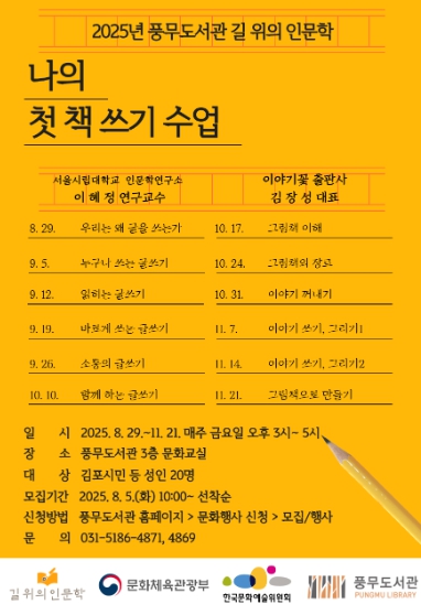 [뉴스노크=김인호 기자] 김포시 풍무도서관은 8월 29일부터 11월 21일까지 매주 금요일 오후 3시에 2025년 길 위의 인문학 ‘나의 첫 책 쓰기 수업’(총 12회)을 운영한다.