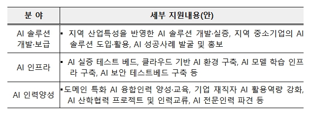 함께 사업을 희망하는 광역지방자치단체는 지역의 산업 특성을 반영하여 자유롭게 기획한 인공지능(AI) 솔루션 개발 및 보급, 인공지능(AI) 실증 실험환경(테스트 베드) 및 클라우드 기반 인공지능(AI) 환경 구축, 기업 재직자 인공지능(AI) 활용 역량 강화 등의 다양한 프로그램으로 신청이 가능하다.