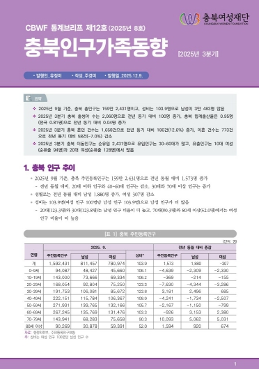 | ▲ 충북여성재단, 충북인구가족동향 2025년 3분기 통계브리프 표지 |