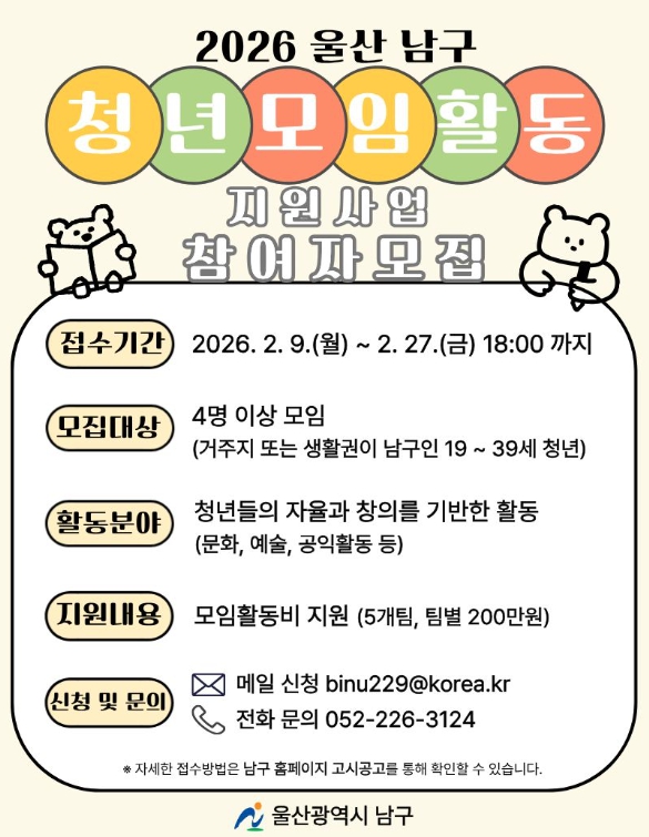 [뉴스노크=김인호 기자] 울산 남구는 2026년 청년모임활동 지원사업인 ‘남구청년, 이모저모’의 참여팀을 모집한다.