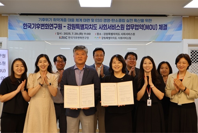 [뉴스노크=김인호 기자] 강원특별자치도 사회서비스원은 7월 29일, 강원복지마루에서 한국기후변화연구원(원장 김동일)과 ‘기후위기 취약계층 대응 체계 마련 및 환경·사회·지배구조(ESG) 경영‧탄소중립 실천 확산’을 위한 업무협약(MOU)을 체결한다고 밝혔다.
