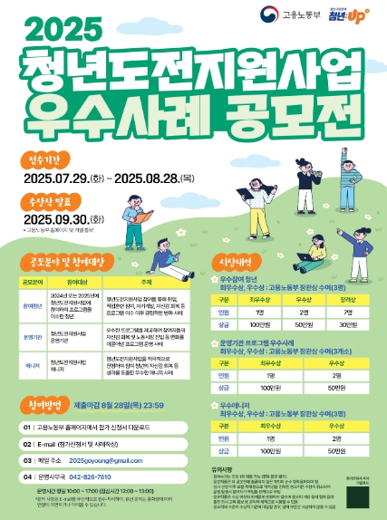 [뉴스노크=김인호 기자] 고용노동부는 7월 29일부터 8월 28일까지 청년도전지원사업, 청년성장프로젝트 및 직장적응 지원 우수사례 공모전을 개최한다. 응모 대상은 해당 사업에 참여한 청년 등으로 자세한 사항은 고용노동부 홈페이지에서 확인할 수 있다.