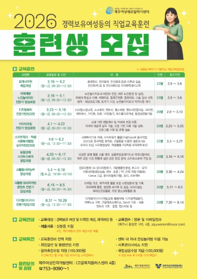 센터별로 보면 제주여성새일센터는 △AI활용 SNS마케팅 콘텐츠 전문가 양성 △AI활용 사무능력 향상 △디지털리터러시 전문가 양성 △디지털 튜터 전문가 양성 △회계사무원 취업 △스마트워크·엑셀 사회복지행정 실무자 양성 △토탈공예 스마트스토어 창업 △커리어코칭 전문가 양성 △치매예방 노인놀이지도 전문가 양성 등 9개 과정에서 186명을 선발한다.