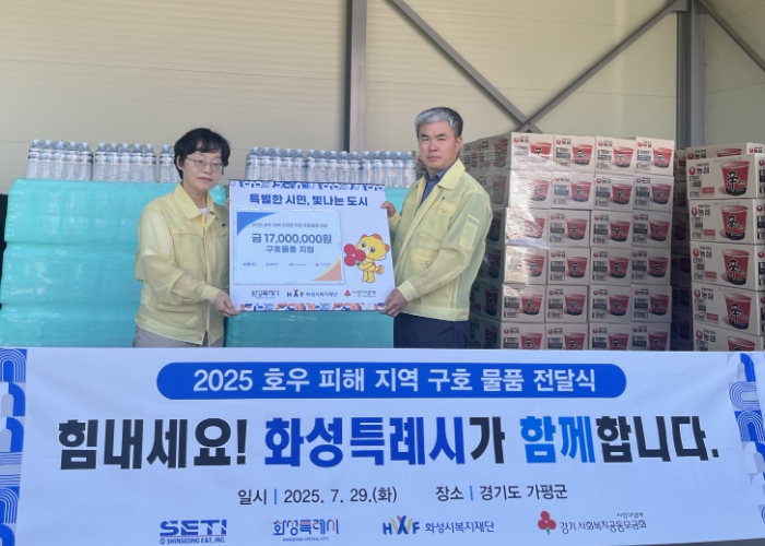 [뉴스노크=김인호 기자] 화성특례시가 29일 가평군에 최근 집중호우로 큰 피해를 입은 주민들을 돕기 위한 총 1천7백만 원 상당의 구호물품을 전달했다.