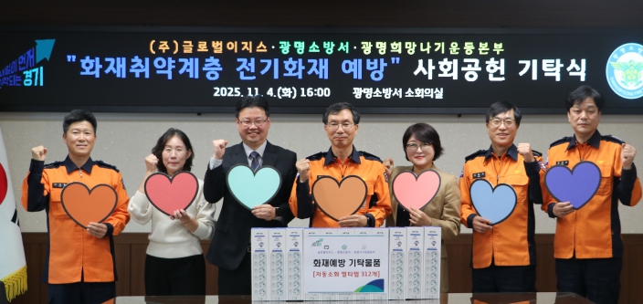 이번 기탁식은 겨울철 소방안전대책의 일환으로 추진되는 ‘화재취약계층 전기화재 예방사업’의 일환으로 마련됐다. 이날 글로벌이지스는 전기 과부하로 인한 화재를 초기에 차단할 수 있는 자동소화멀티탭(엘리펀탭) 312개를 광명희망나기운동본부를 통해 기탁했으며, 기탁 물품은 겨울철 화재위험이 높은 취약계층 가정에 순차적으로 전달될 예정이다.