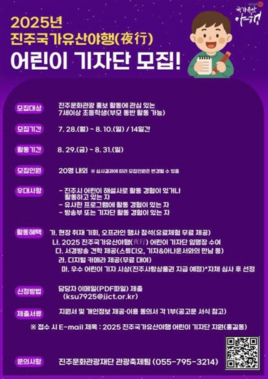 모집 대상은 진주문화관광 홍보에 관심 있는 7세 이상 초등학생으로 부모님 동반 활동도 가능하며, 방송부·기자단 활동 경험자와 진주시 어린이 해설사 활동 경험자에게는 우대기회가 주어진다. 총 20명을 선발하며, 기자단은 8월 14일 발대식을 시작으로 8월 29일~31일까지 야행 관련 취재 활동을 진행한다.