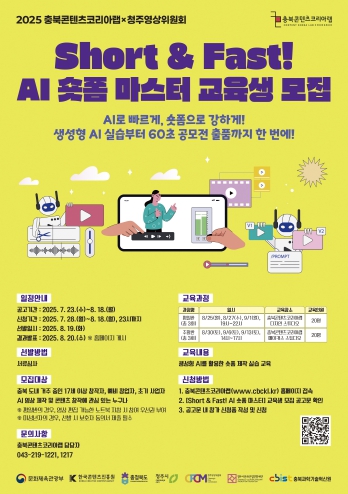 [뉴스노크=김인호 기자] 충북콘텐츠코리아랩은 오는 28일부터 8월 18일 오후 11시까지 ‘Short & Fast! AI 숏폼 마스터’ 과정 교육생을 충북콘텐츠코리아랩 누리집에서 모집한다.