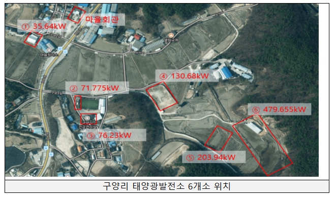 구양리 ‘마을태양광 발전소’는 ’22년 산업부의 ‘햇빛두레 발전소’ 시범사업 지원을 받아 태양광 발전시설을 설치했다. 발전시설은 마을 공동 소유의 마을회관, 체육시설, 마을창고, 잡종지(농지 전용) 등에 1MW 규모이다. 이를 통해 나오는 수익은 마을협동조합에서 공동으로 관리하며, 마을식당 무료급식 운영, 마을 행복버스 운행 등에 쓰이고 있다. 이런 모델을 바탕으로 새 정부는 국정과제로 주민공동체 주도의 햇빛소득마을 500개 조성을 발표했다.
