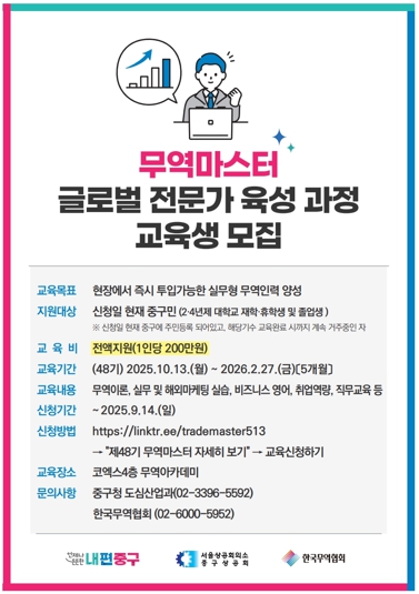[뉴스노크=김인호 기자] 서울 중구가 서울상공회의소 중구상공회 및 (사)한국무역협회와 함께 추진하는 '2025년 무역마스터 글로벌 전문가 육성 사업' 교육생을 모집한다.