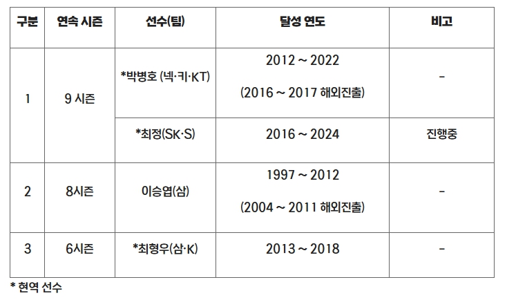 ▲ 연속시즌 20홈런 기록 순위 (2025. 8.30현재) |