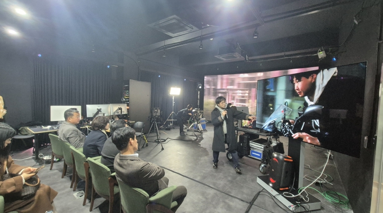먼저 1부 ‘버추얼프로덕션 기술시연회’는 진흥원 IT벤처센터 2층 교육용 버추얼스튜디오 ‘엣지스테이지’에서 진행됐으며, 국내 대표 VFX 기업인 ㈜웨스트월드가 참여해 △LED 월 기반 버추얼스튜디오 △실시간 렌더링 △카메라 트래킹 △가상환경 합성 등 버추얼프로덕션 핵심 기술을 실제 제작 환경과 동일한 조건에서 시연했다.